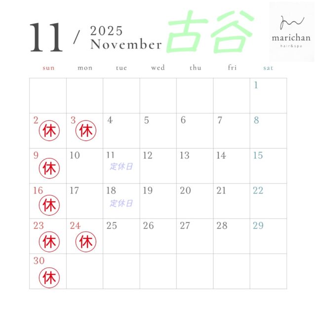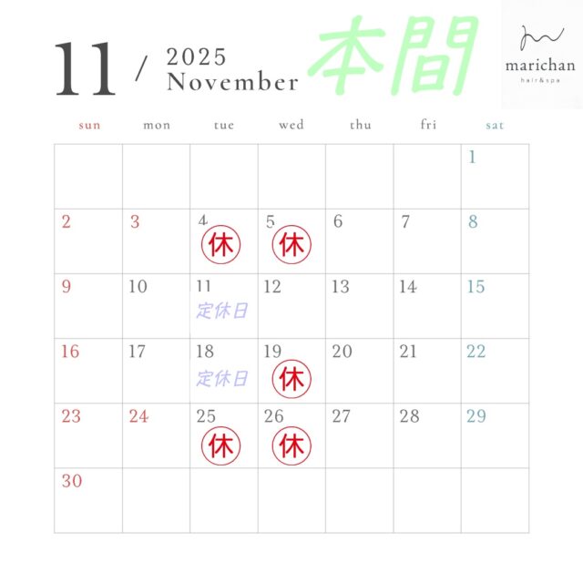 hair&spa marichan 2025.11 スタイリスト公休のお知らせです。