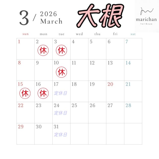 hair&spa marichan 2026.3 スタイリスト公休のお知らせです。